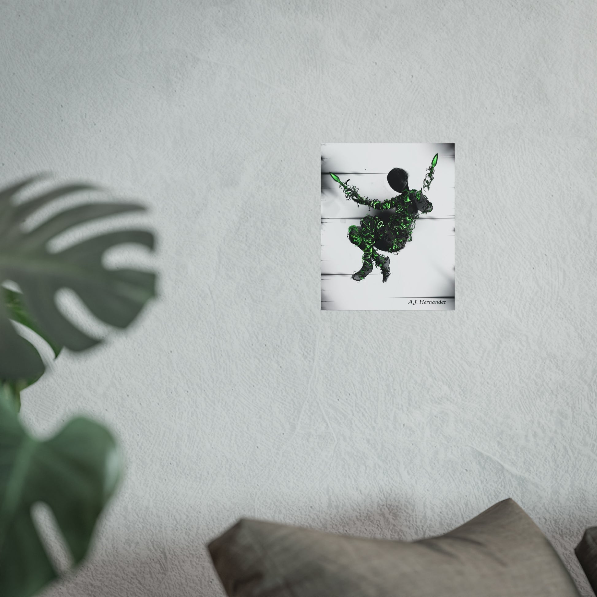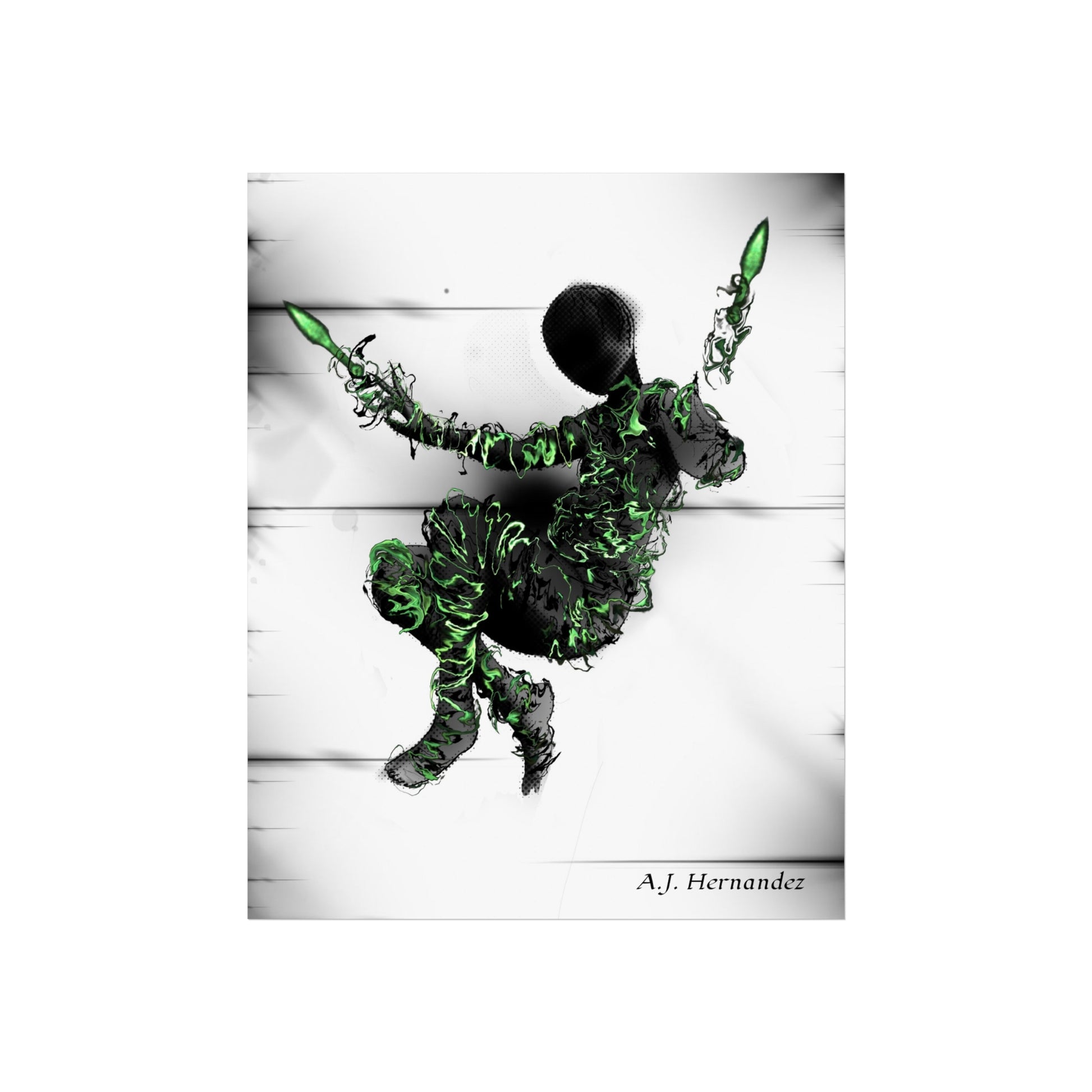 A striking fine art poster that blends abstract motion with organic, vivid green detailing. The composition centers on a shadowed, faceless figure wrapped in textured foliage-like elements and holding two luminous green blades, set against a soft, paneled white backdrop. The giclée-quality print on gallery-grade 220 gsm paper brings out deep contrasts and crisp detail while the smooth matte finish reduces glare and emphasizes the print’s tactile presence. This piece reads like a moment caught between movement and stillness — a dramatic accent for a minimalist living room, a creative studio wall, or a curated gallery nook. It invites quiet curiosity and rewards close viewing: the subtleties of the REACH-certified inks and EUTR-compliant materials mean you’re displaying responsible, museum-style quality that ages well.